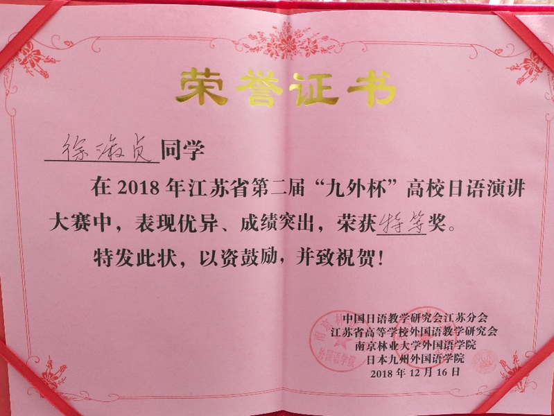 2018年12月16日,在南京林业大学举办的“2018年江苏省第二届九外杯高校日语演讲大赛”中,我校永利集团3044官网欢迎您日语系组织学生参赛并获得特等奖及上海总领事特别奖殊荣。