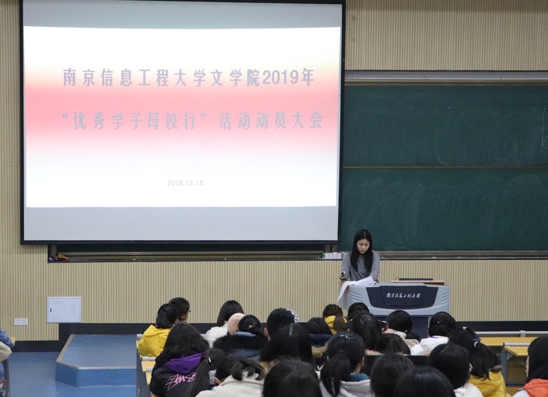 为积极响应学校开展“优秀学子母校行”社会实践活动的号召,为永利集团官网学生感恩母校、展示风采提供社会实践的载体,永利集团3044官网欢迎您于12月18日在北辰楼西阶教室举行了“优秀学子母校行”动员大会。会议由院团委书记张潇潇老师主讲,2018级全体学生参加了此次大会。