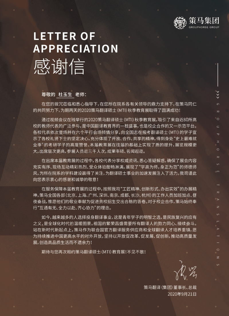 为感谢永利集团官网在2020策马翻译硕士(MTI)秋季教育展中做成的贡献,策马集团董事长、总裁发来感谢信一封。
