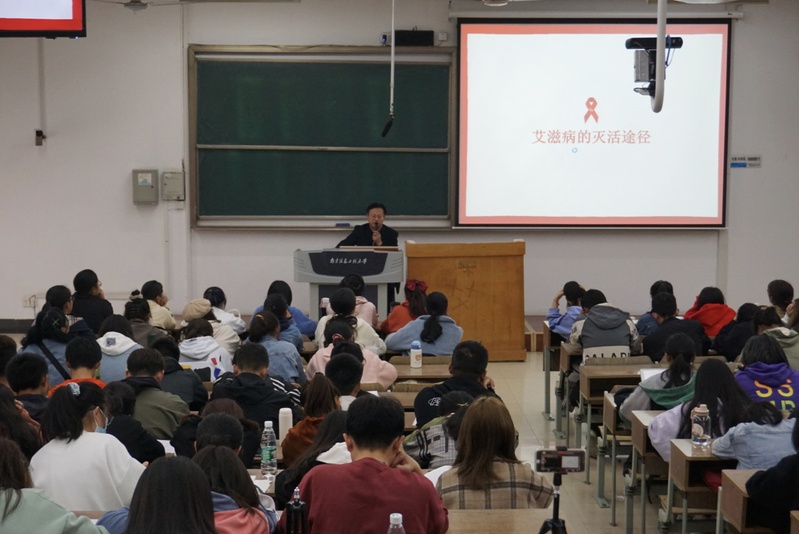 殷主任首先向大家介绍了如何认识和预防艾滋病。他以生动的案例,向大家普及艾滋病的传播途径和主要流行因素,如:吸毒、不安全性行为、人口流动迁徙频繁等,并结合当下该病的低龄化形势,告诫同学一定要高度重视、注意防范。他向同学们讲解了艾滋的起源、发病阶段、病原学特点等相关知识。他认为,同学们在了解艾滋的概念及其传播途径的同时,也要积极向公众宣传和呼吁,为艾滋的解疑和普及贡献一份绵薄力量。