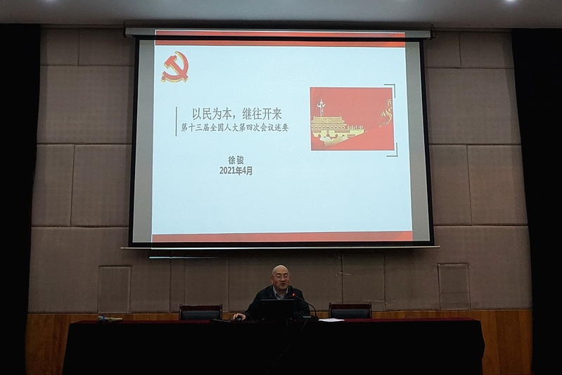 为深入学习贯彻十三届全国人大第四次会议精神,4月14日下午,永利集团3044官网欢迎您党委邀请法政学院副院长徐骏博士以“2021年全国人大热点解析” 为题,向学院全体师生党员上了一堂学习宣传课。活动由永利集团3044官网欢迎您党委书记朱庆峰主持。