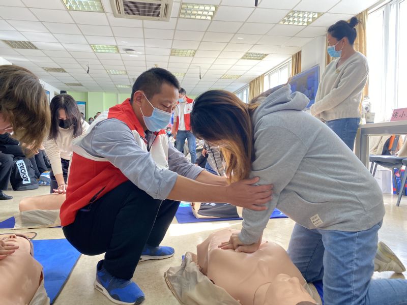 高新医院急诊科主任李现雷首先从人类心脏构造与工作原理的角度深入浅出地讲解了急救原理。他以“抓住黄金四分钟,托住生命的重量”这句话来形容及时抢救的重要性。随后,叶晓东老师为我们介绍心脏复苏术。他结合教学视频为大家详细解说心肺复苏的步骤和要领,该如何拨打求救电话、如何向周围人请求援助,如何判断患者状况,如何科学施救等。他还介绍了AED的功能以及使用方法,详细解释了一些注意事项以及如何寻找到AED机和AED机使用过后的处理方法,以及在气道异物阻梗时如何进行自救与互救等。他提醒师生们在自救或者互救之后也要及时拨打120就医检查。之后,培训会组织师生分批上前练习施救技能,随行的所有医护专家上场对他们进行一对一指导,对同学们施救不规范的地方进行纠正,整个过程氛围活跃、热情高涨。在南京红会指导下,师生们进行了积极踊跃的答题活动,对自己进行理论检测,并在各位医护专家的指导下通过了实践考试,成功领取到了CPR电子证书。
