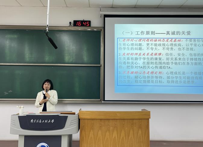 会议最后,为加强师德师风建设,引导各教职工进一步了解学生心理状况,大学生心理咨询中心钱春霞主任在心理工作讲座中对学生心理状况进行分析,并援引案例,加深了教职工对学生心理的认识,为教师开展教学工作提供了有益指导。