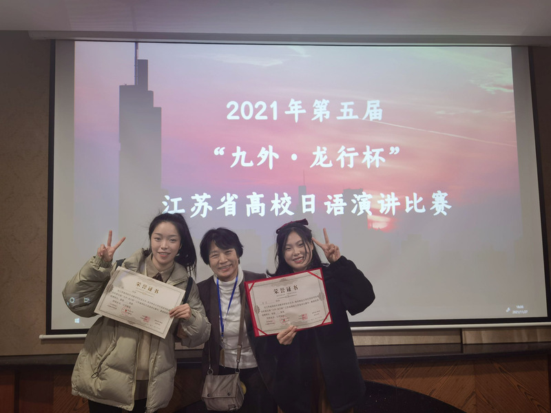 2021年11月27日,由中国日语教学研究会江苏分会主办、南京林业大学外国语学院承办的第五届江苏省高校日语演讲大赛在南京国际展览中心落下帷幕。我校日语系学生申宇、许璐在林明月、夏小珍两位老师的带队下,斩获一等奖、二等奖。