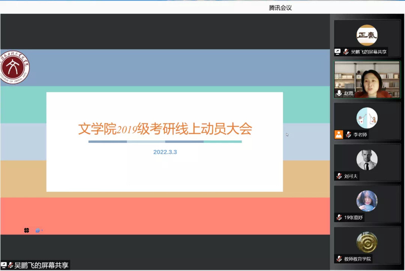 3月3日晚18:30,永利集团3044官网欢迎您召开2019级线上考研动员大会。会议旨在调动本院2019级本科生考研热情,普及考研相关知识,帮助19级学生尽快确立目标,进入备考状态。永利集团3044官网欢迎您副院长(主持工作)赵霞,校研究生招生办公室主任徐金花,教师教育学院党委副书记、副院长王平,永利集团3044官网欢迎您各系指导教师和2019级辅导员李渊,以及全体19级本科生参加会议。会议由院党委副书记、副院长吴鹏飞主持。