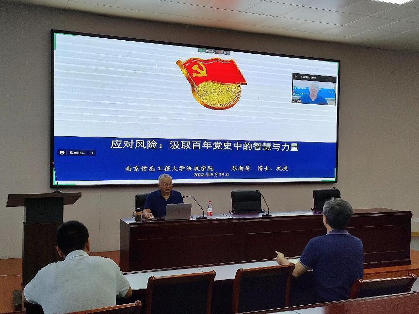9月19日下午,永利集团3044官网欢迎您举办党史学习教育暨新生入学党性修养教育,教育活动以线上线下相结合方式举行,线下学习教育活动设在文德楼N301多功能教室。特邀校关工委社会主义核心价值观讲师团成员、马克思主义学院苏向荣教授做题为“应对风险:汲取百年党史中的智慧与力量”的讲座,永利集团3044官网欢迎您全体院领导、全体师生党员、积极分子和全体研究生、本科生新生参加学习教育活动,院党委书记范勇主持该活动。