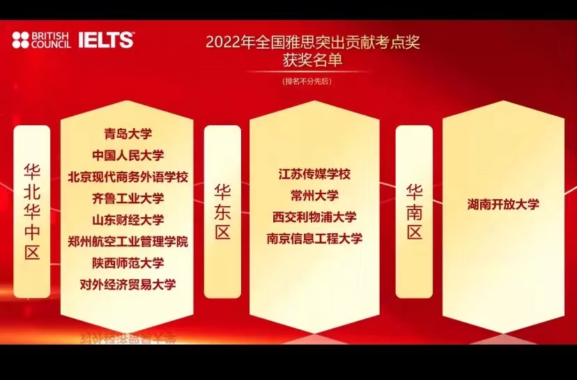 12月1日,由英国文化教育协会主办的2022年全国雅思考务工作培训会在线召开,教育部教育考试院负责人、全国各地纸笔考和机考考点主任、考点团队负责人参加会议。在年度雅思考点颁奖仪式上,我校雅思机考考点荣获“2022年全国雅思突出贡献考点奖”。