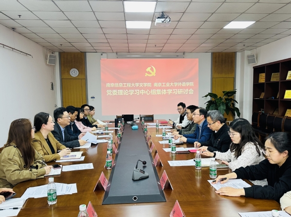 随后双方在南工大外语中心会议室联合开展了党委理论学习中心组集体学习活动。会上,郭雨书记领学了习近平总书记给北京外国语大学老教授的回信。他表示,要深刻领会“外语院校大有可为”的重要意义,以培养有家国情怀、有全球视野,有专业本领的复合型人才为目标,扎实践行好立德树人的教育使命,不负总书记的殷切希望,为推动中国更好走向世界、世界更好了解中国贡献力量。张翔书记领学了习近平给外文出版社的外国专家的回信和习近平考察湖南第一师范学院的讲话,并结合南工大外院的学科建设、人才培养、思政教育等情况做了深入阐释。