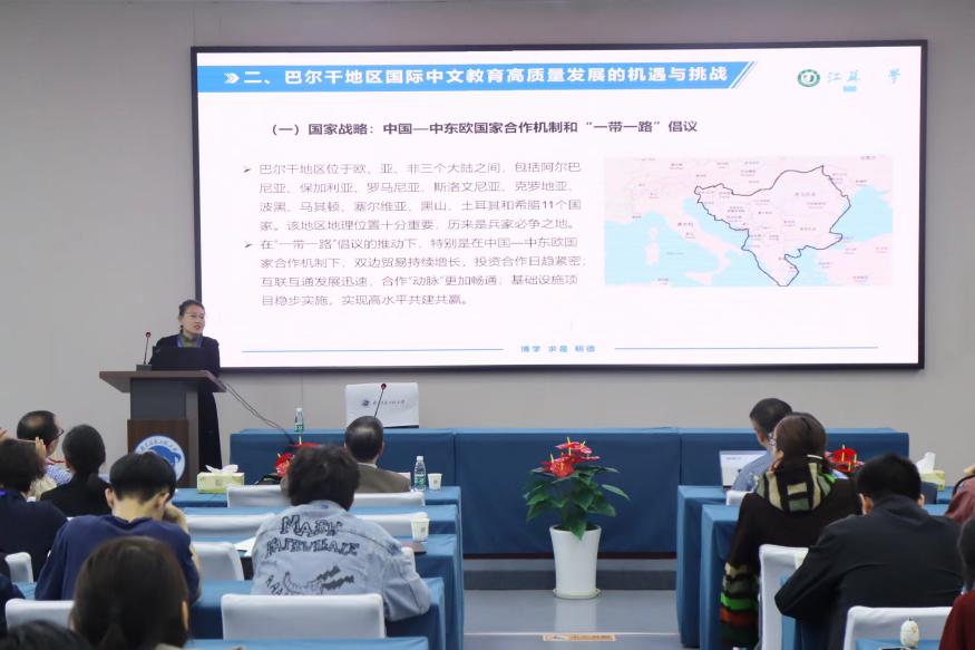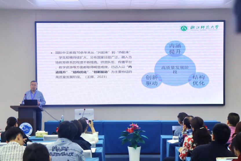 首先由程爱民教授发表了题为“全球语境中的国际中文教学:机遇与挑战”的主旨演讲,他表示,中文作为世界了解中国及中华文化的重要载体和与中国交往的重要工具,其战略价值和实用价值正在不断提升,全球范围的中文教学经历了一个较长时期的快速发展阶段。但是由于国际形势的变化和各种因素的影响,国际中文教学也遇到了一些问题和挑战。针对以上问题和挑战,程教授从国际中文教育现状和新时期推进全球国际中文教育发展两个方面展开了详细讨论。随后,王辉教授围绕“中文成为世界语言的六大转向”进行演讲,与会者进行深入探讨。他强调,在中文从国际语言迈向世界语言、中国从语言大国迈向语言强国的进程中,国际中文教育需要完成一系列转变,使中文成为推动文化强国建设的磅礴之力。叶军教授对“中文+”及有关概念的辨正进行了阐述。他指出,“中文+”应以汉语教学为中心,辐射有关行业领域,明确“中文+”是服务“一带一路”职业或专业需求的语言教育,并提出“学科中文”的概念且做了深入阐述。最后,任晓霏教授从国际中文教育区域国别研究的战略意义、巴尔干地区国际中文教育高质量发展的机遇与挑战、巴尔干地区国际中文教育实践与研究基地的构建思路这三个方面进行了分享介绍。