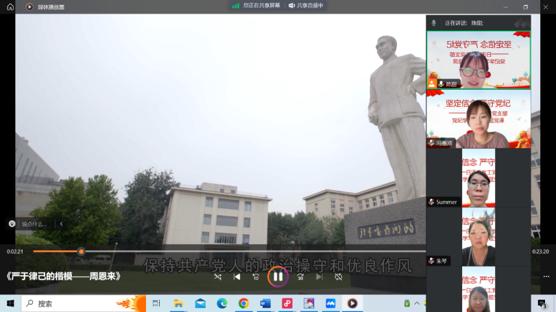 会议开始,机关支部全体人员集体观看了党纪学习教育主题片《严于律己的楷模——周恩来》,周恩来同志恪尽职守的工作作风,廉洁自律的生活作风让支部党员深切感受到学习党规党纪不仅是学习理论方法,更要将其融入工作生活,真正做到知行合一。