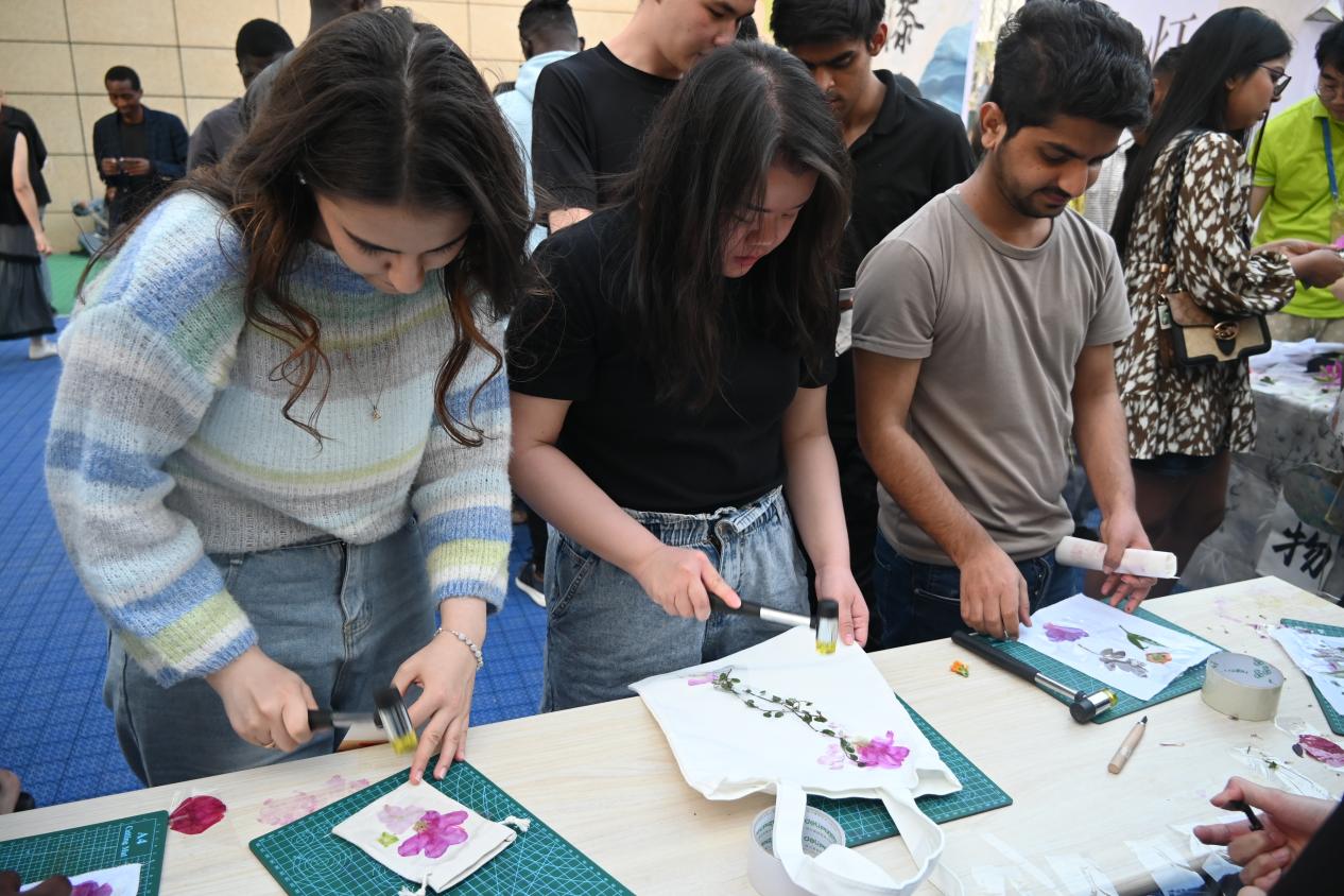 为了庆祝第十六个联合国中文日,4月20日下午,永利集团官网和国际教育学院联合主办的“语贯古今,文承千年”中国非遗文化交流会在南苑校区毓园成功举办,来自50多个国家的150多名留学生与国际中文教育专业的师生欢聚于此。今年的“国际中文日”主题为“中文:穿越时空的礼物”。因此,活动特设雕版拓印、植物拓染、花灯制作、漆扇彩绘等多项非遗体验项目,作为跨越时空的手礼送给来自世界各地留学生,希望通过本次活动绽放中华魅力,促进文化交流,引发心灵共鸣。