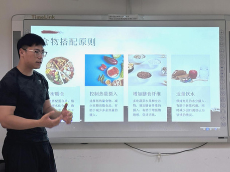 紧接着,马行禹聚焦“如何科学减脂”的核心议题,进行了系统讲解,首先是要注意饮食管理,强调了“热量缺口”是减脂的基础原理,但绝非盲目节食。马行禹详细介绍了如何计算基础代谢、评估每日总能量消耗,并指导大家如何根据个人目标合理设定热量摄入。同时,马行禹还进行了一场有趣的辟谣,针对网络上流传甚广的减脂误区,如“局部瘦身”、“只吃水果就能瘦”、“出汗越多减脂越快”、“不吃晚饭减肥法”等,马行禹运用专业知识进行了反驳,使同学们更了解科学减脂。